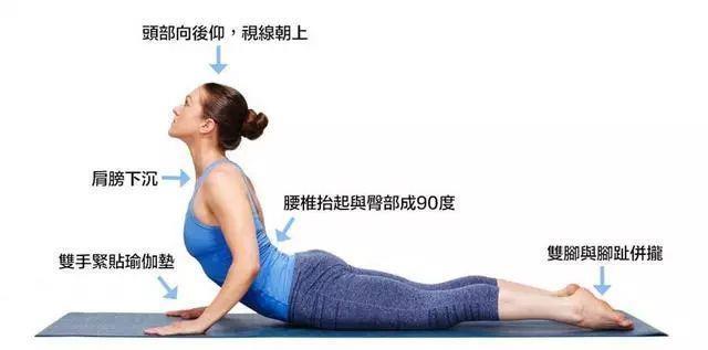 步驟:手肘置於肩膀正下方,手掌打開,吸氣將胸、下巴抬起、肩膀放鬆,肚子往下沉,腰、臀部、大腿放鬆,停留3-5個呼吸。