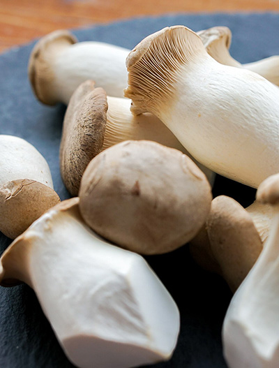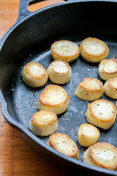 購買杏鮑菇時,必須選擇粗莖的。越胖越好。細柄杏鮑菇絕對不適合做這道菜,因為重點是模仿扇貝的外觀。有了最胖的杏鮑菇後,將它們切成1英寸的圓片。保留蘑菇的頂部以備不時之需。
