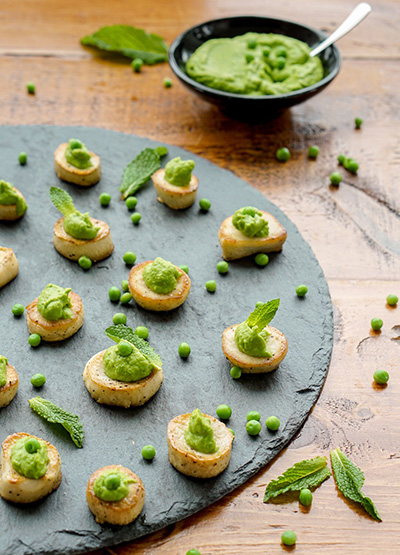 沒錯,這是一道完美的開胃小菜-杏鮑菇「扇貝」配薄荷豌豆泥。這些看起來很花哨的小點,準備起來卻是輕而易舉,準備好食材後,完美烤出純素食杏鮑菇打動每個人,上面放著一口奶油豌豆及新鮮的薄荷,飲食控制的運動愛好者,你也會愛上這道小菜的。