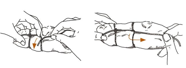 1. 先將棉繩拉直按住,在按壓處後的棉繩往下繞雞腿捲一圈後,在按壓處由內往外拉出棉繩。