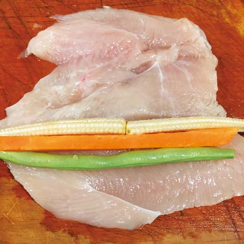 將雞胸肉攤平,放上玉米筍、紅蘿蔔、四季豆。