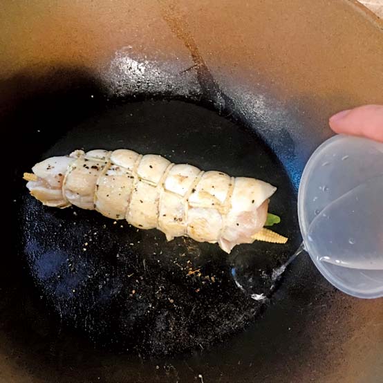 將雞胸肉放入平底鍋中煎到表面熟成,加入4大匙冷水,蓋上鍋蓋悶煮到水分收乾,使肉捲中心熟成即完成。