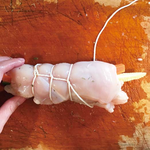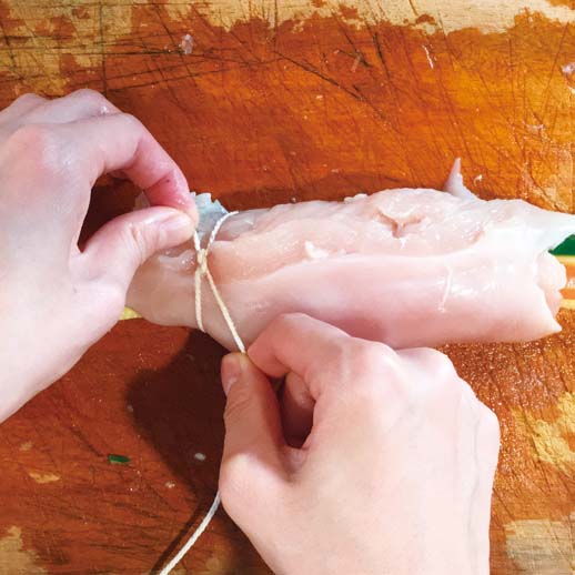 重複繞結的步驟,將雞腿捲固定(棉繩繞結綁法請參考memo示意圖)。